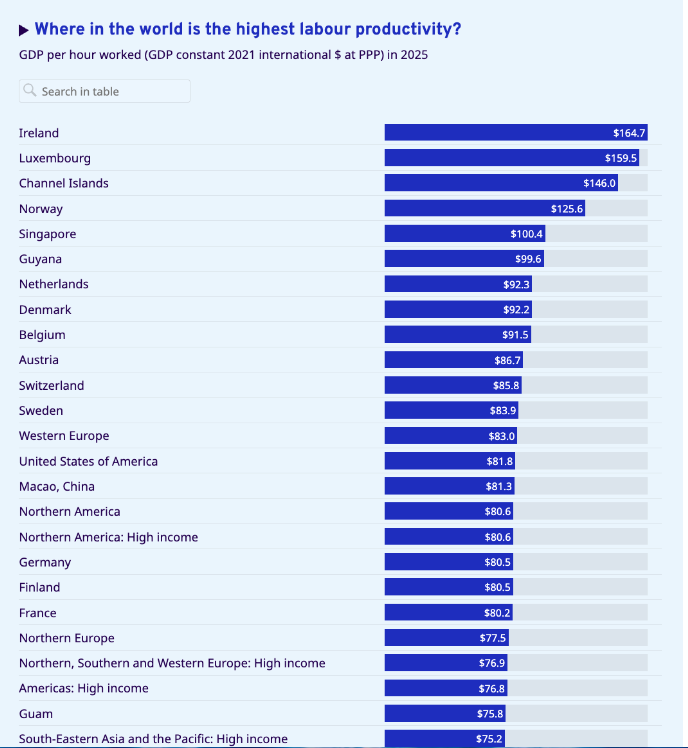 Is de VS zo veel productiever dan de EU, zoals Amerikanen jaar in, jaar uit beweren? Niet volgens de cijfers van de International Labour Organization. Het gemiddelde ligt wel lager, omdat enkele grote landen (Duitsland, Frankrijk) onder de VS presteren.