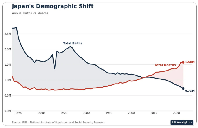 In 2023 kromp de bevolking met 850.000 mensen. In 2025 waren er nog 123 miljoen Japanners. De daling begon na 2010, toen de bevolking piekte op 128 miljoen. Volgens deze grafiek, afgeleid uit gegevens van het Japanse Nationaal Instituut voor Bevolkingsonderzoek (NIPSS), versnelt de krimp. Toenemende immigratie vertraagt het tempo.