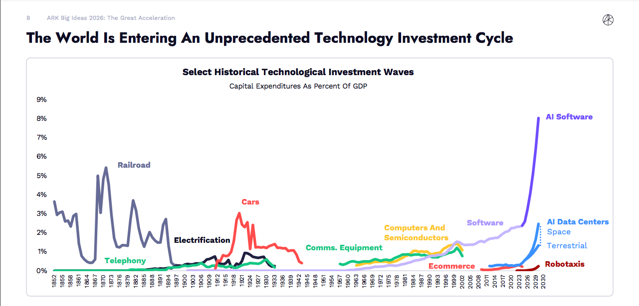 (Bedragen zijn percentages van BBP, dat is een goede manieren om investeringen over een periode van tientallen jaren te vergelijken. Je haalt dingen als inflatie en devaluatie eruit. - ARK Invest is een beleggingsfonds dat zich richt op 'disruptive' innovatie.)