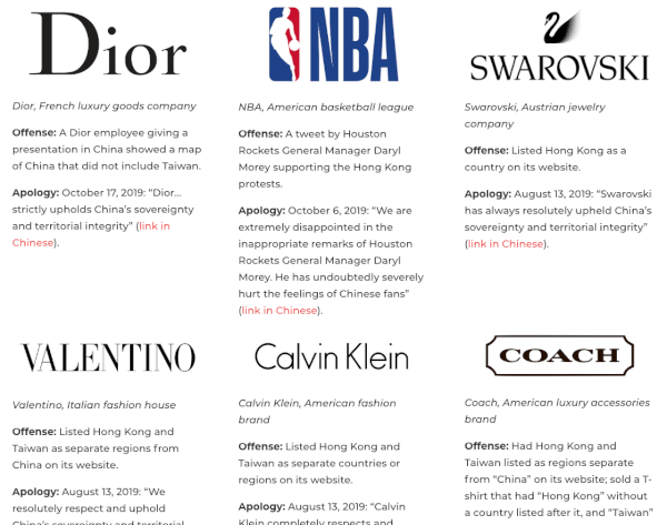 Fragment van lijst van multinationals die aan China hun excuses hebben aangeboden, en waarom. Totaal 21 op deze lijst, waaronder verder ook Audi, Zara, Versace, GAP, Marriott. China gebruikt zijn economische macht niet alleen om internationaal uit te breiden maar ook om zijn niet-Westerse waarden en normen – waaronder: censuur – op te dringen aan de buitenwereld. Waag het niet om in een powerpoint een kaart van China te tonen, waarop Taiwan of Hong Kong ontbreken ….