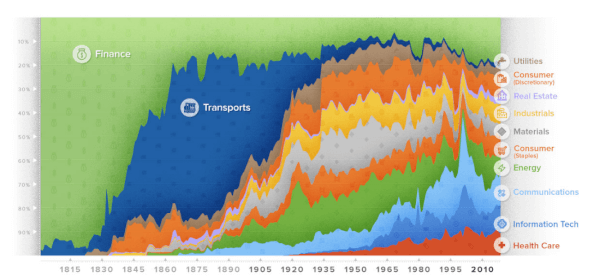 Gewicht van twaalf sectoren van het bedrijfsleven in de Amerikaanse aandelenbeurzen over de afgelopen 200 jaar.