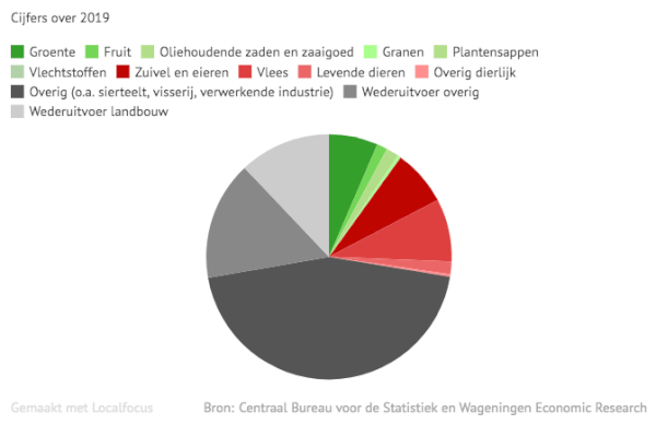 De waarde van de export is € 26 miljard, ‘dat is nog geen 28% van het exportcijfer waarmee de LTO en Farmers Defence Force mooie sier maken,’ concludeert FtM na vergelijking van rapporten van CBS en Wageningen.