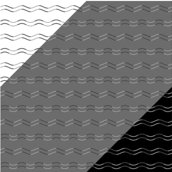 Wat ziet u in het grijze gebied: een lijn die golft of zigzagt? De ene dubbele golft, de andere zigzagt. Dat komt door de donkere gedeeltes van de lijnen. Bij de golvende lijn is de ‘bovenkant’ van de bocht zwart; in de lijn die een zigzag lijkt, is de rechterhelft van de curve zwart. En deze perceptie gebeurt alleen als er een grijze achtergrond is, niet een witte of zwarte. Wat gebeurt er in onze hersenen? We wisten al dat het brein verschillende mechanismes heeft om bochten en hoeken te herkennen. Kennelijk zitten die elkaar in de weg hier. Maar waarom? Daar is nog geen sluitend antwoord op. Theorie: als wit en zwart elkaar ontmoeten schept dat de illusie van een verticale lijn.