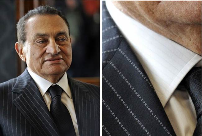 ‘Zijn pikzwarte haar was geverfd, en de krijtstrepen in zijn pakken bestonden uit de letters van zijn naam, telkens herhaald, in de stof genaaid door Londense kleermakers.’ Uit de necrologie van Hosni Moebarak in The Economist. (kijk maar.)