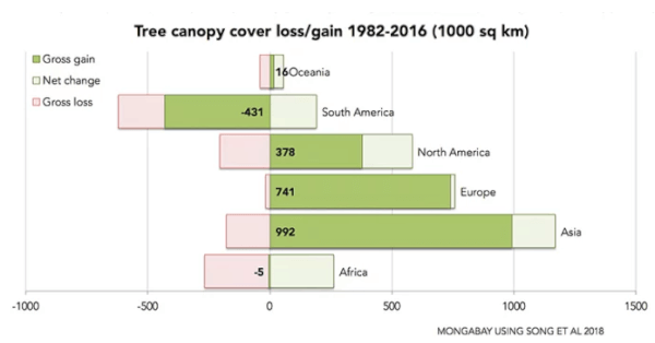 De hoeveelheid bos op de wereld is tussen 1982 en 2016 toegenomen met 2,24 miljoen vierkante kilometer, zegt een nieuwe studie in Nature. De FAO, de meest geciteerde bron over boomplant, zegt ‘afgenomen.’ Het verschil valt te verklaren doordat de FAO niet commerciële bosbouw meetelt. Dus als een stuk tropisch regenwoud wordt omgehakt en er worden palmen geplant, telt dat voor de FAO niet mee. Voor Nature wel. Bebossing nam sterk toe in de VS, Europa, China en Rusland.