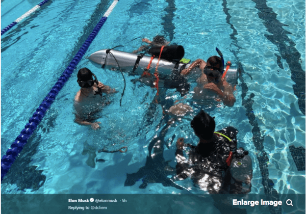 Terwijl u dit weekend op het strand lag heeft Elon Musk een mini-duikboot ontworpen waarmee – zegt hij – de jongens die opgesloten zitten in een grot in Thailand gered kunnen worden. Hij postte filmpjes op twitter, waarin het ding wordt getest in het schoolzwembad van Pasadena.