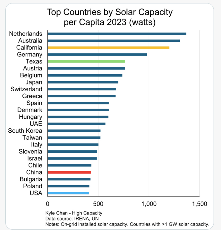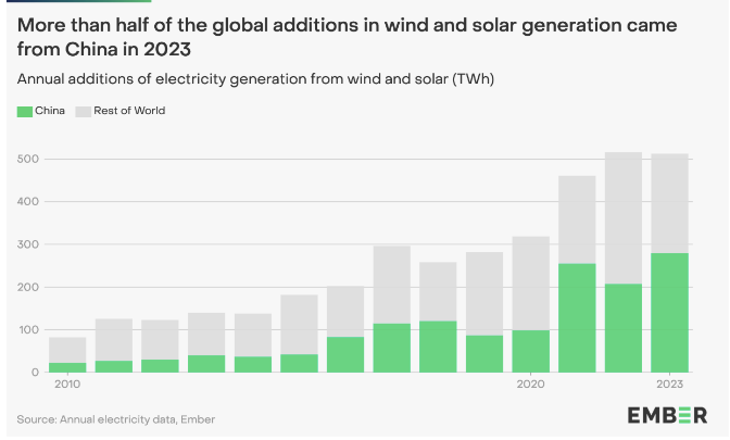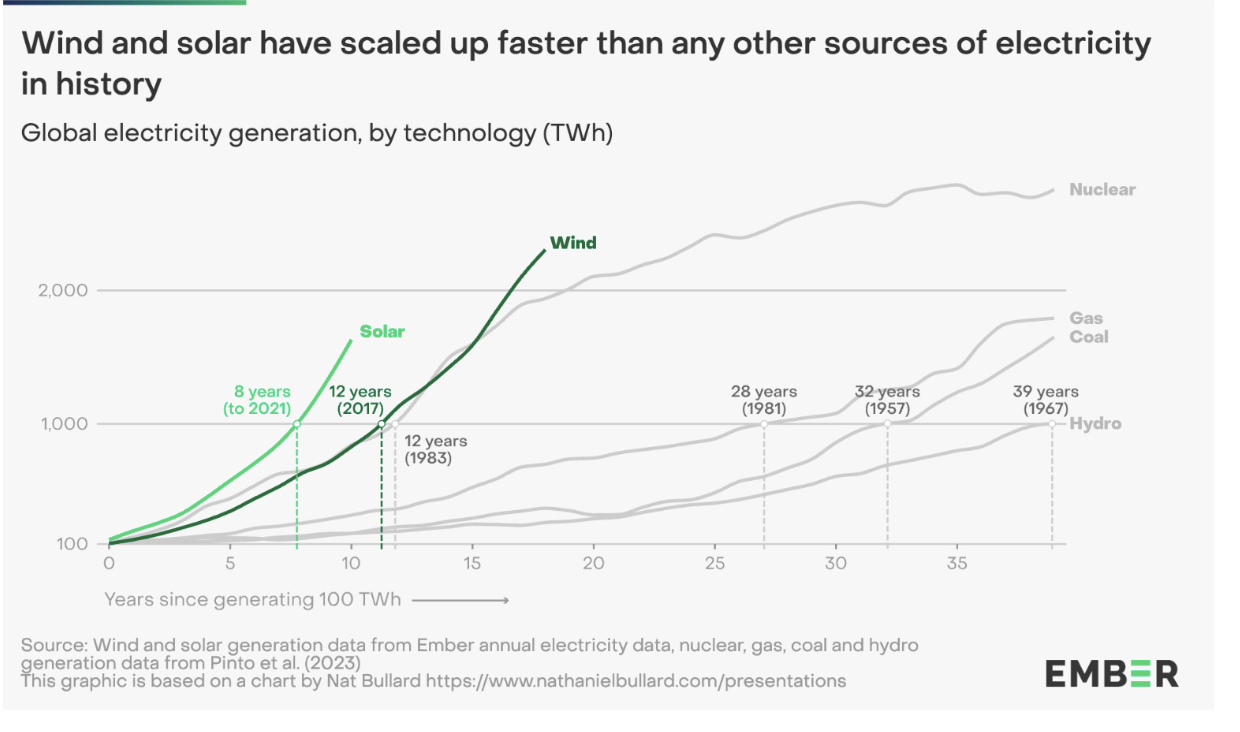 Duurzame elektriciteitsopwekking - voornamelijk door zonnepanelen - overtreft iedere keer verwachtingen. Tooze citeert uitgebreid een rapport van Ember, een think tank.