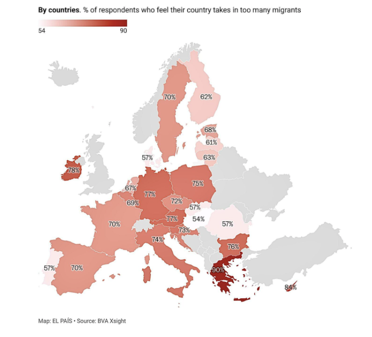 Tweederde tot driekwart van de bevolking vindt dat er te veel migranten worden toegelaten. Dit geldt voor vrijwel alle Europese landen. Het artikel, op basis van een enquete door El Pais, geeft verder cijfers over de daadwerkelijke stand van zaken: hoeveel immigranten als percentage van totale bevolking. Opvallend: Hongarije, Slowakije en Roemenië zijn toleranter dan de rest, misschien omdat ze erin slagen om migranten te weren: immigranten vormen daar 0,6-2,6% van de bevolking. Zweden en Oostenrijk hebben de meeste immigranten als percentage van de bevolking: 19%. Ter vergelijking: in de VS is dat cijfer 15%, in Canada 21%, Australië 30%.
