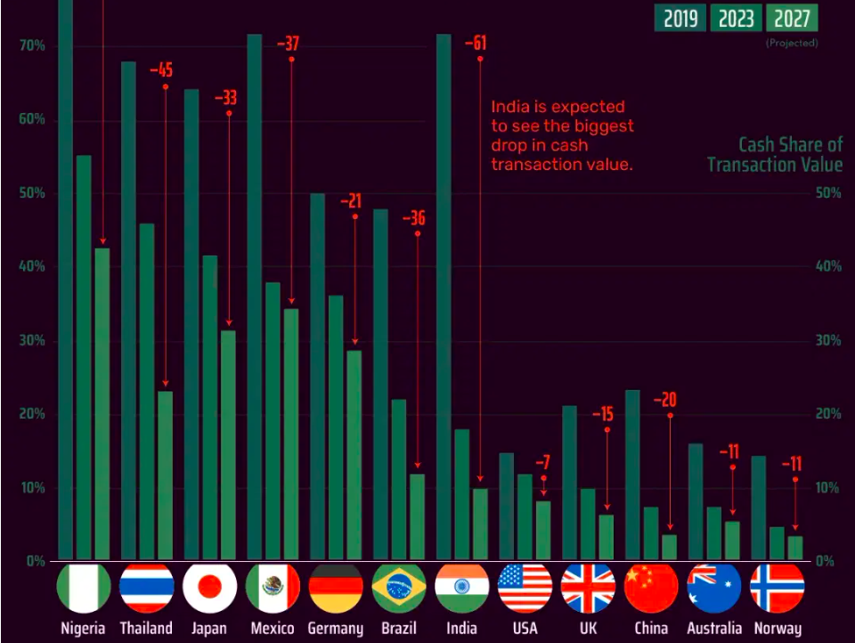 In Duitsland was in 2019 nog de helft van alle betalingen in contanten; vorig jaar minder dan 30%. In Noorwegen, in vier jaar tijd van 15% naar 5%. In Japan, 65% naar 42%. En kijk naar India ...