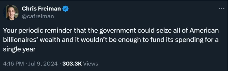 Er is helemaal niet zo veel rijkdom ('wealth') in de wereld. Al het geld op de bankrekeningen van alle miljardairs van Amerika is 5,4 biljoen (duizend miljard); de federale overheid geeft jaarlijks 6,2 biljoen dollar uit. Pik al het geld van Elon Musk en Bill Gates en Jeff Bezos in, en het is nog niet genoeg. 'En je kunt het maar één keer doen ....' zegt Noah Smith.