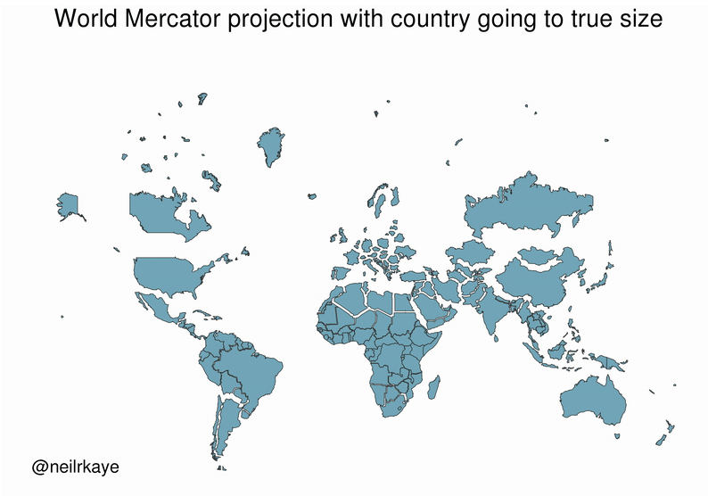 Nooit vergeten: Mercator-projectie vervormt de werkelijkheid. Hoe verder van de evenaar, hoe meer: