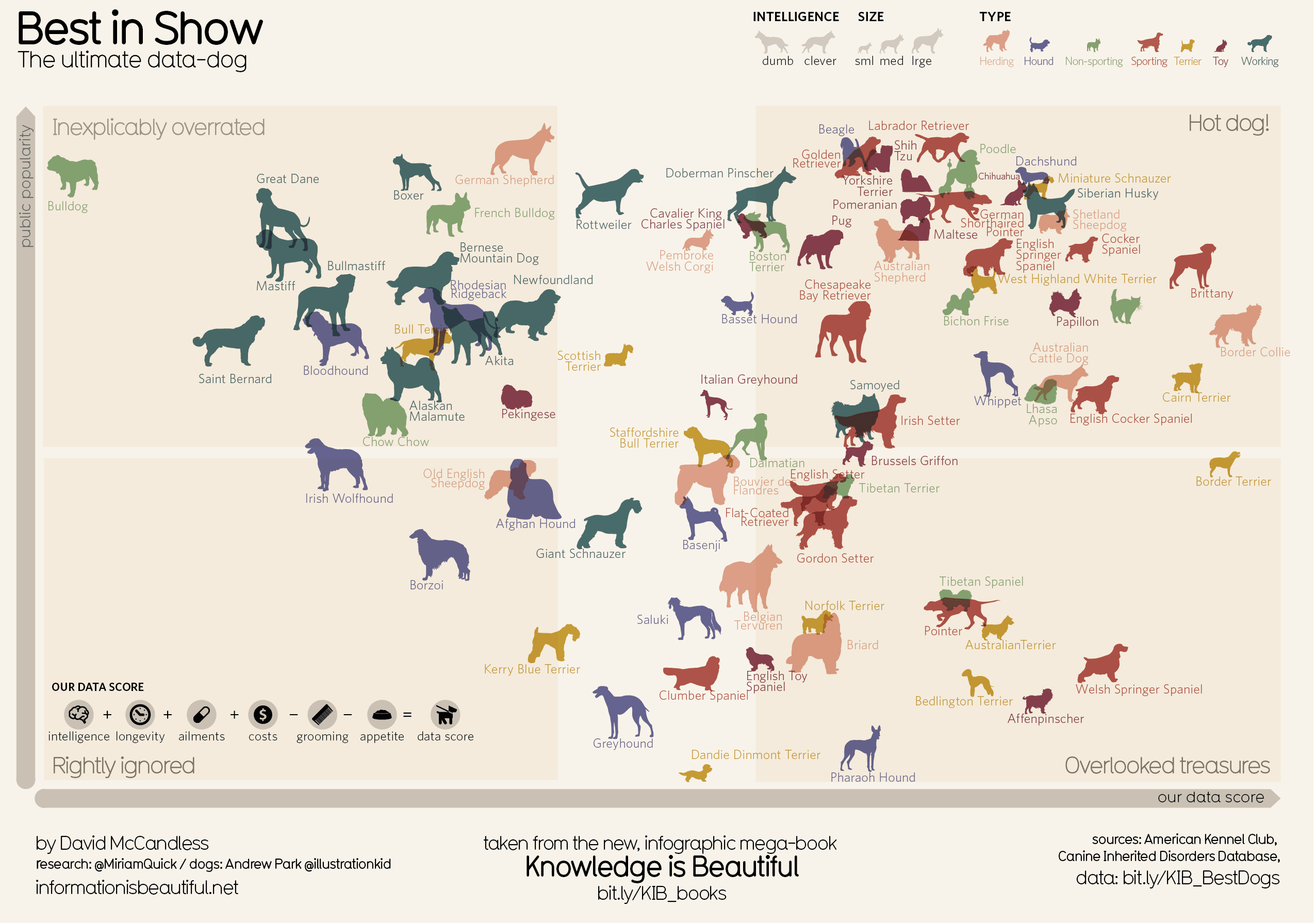 Kwaliteiten van honden, en populariteit van rassen. Bulldog, Duitse herder en Deense dog zijn volgens de makers onbegrijpelijk populair; Labradors, poedels en teckels terecht geliefd; de Welsh springer spaniel, de Bedlington en Australische terriers verdienen meer erkenning. Criteria? Onder andere algemene gezondheid, levensduur en intelligentie. Klik op kaart voor detail.