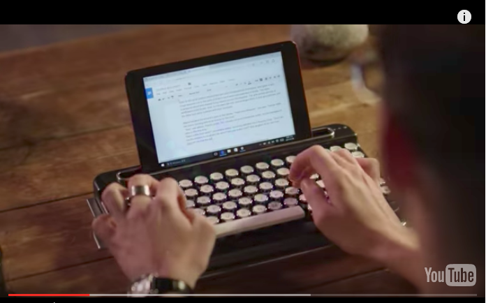 Retro toetsenbord met gleuf voor tablet. Verschillende varianten, met speciaal ontworpen toetsen en ouderwets lettertype. Op Indiegogo, prijs bij voorinschrijving $119.