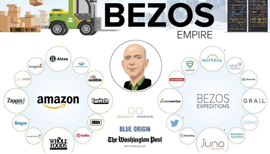 Niet alleen Amazon, ook baas en oprichter Jeff Bezos lijkt langzaam de hele wereld over te nemen. Links aankopen door Amazon, rechts participaties door Bezos; midden Nash, een BV van Bezos privé. Meer details achter de klik.