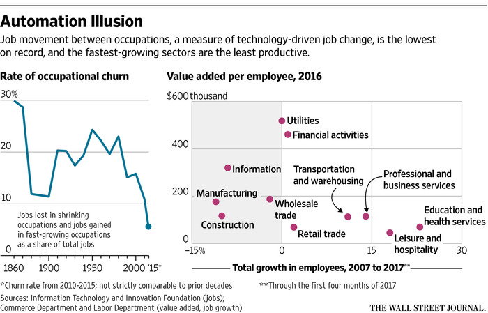 In het voorlopig nog niet beslechte debat over de vraag of we allemaal overbodig worden door slimme robots, hier een bijdrage van een openlijk partijdige club: De Stichting voor ‘Information Technology & Innovation’ in de VS. Hun argument: we maken ons ten onrechte zorgen dat banen verdwijnen door technologie, bijvoorbeeld software die veel werk overneemt van advocaten, of Uber die taxichauffeurs overbodig maakt. Als je kijkt naar de mate waarin de afgelopen 20 jaar banen verdwijnen, afgezet tegen de mate waarin nieuwe soorten banen ontstaan, dan is het juist relatief rustig vergeleken met 1950-2000, en zeker 1850-1870. Toen was er bijna twee keer zo heftige ‘occupational churn.’