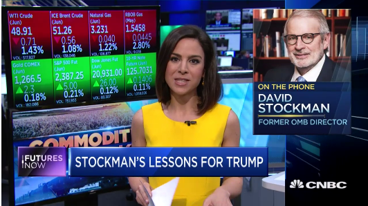David Stockman was directeur van het Budget Office onder Ronald Reagan in 1981-85. Hij bereidde één van de meest drastische belastingverlagingen van de 20ste eeuw voor. Won van een door Democraten gedomineerd Congres. Dus als hij spreekt, weet hij waar hij het over heeft. In een gesprekje met CNBC maakt hij gehakt van de voorstellen van president Trump. ‘Dead before arrival,’ zoals hij zegt. Onhaalbaar. Wie er in gelooft houdt zichzelf voor de gek.