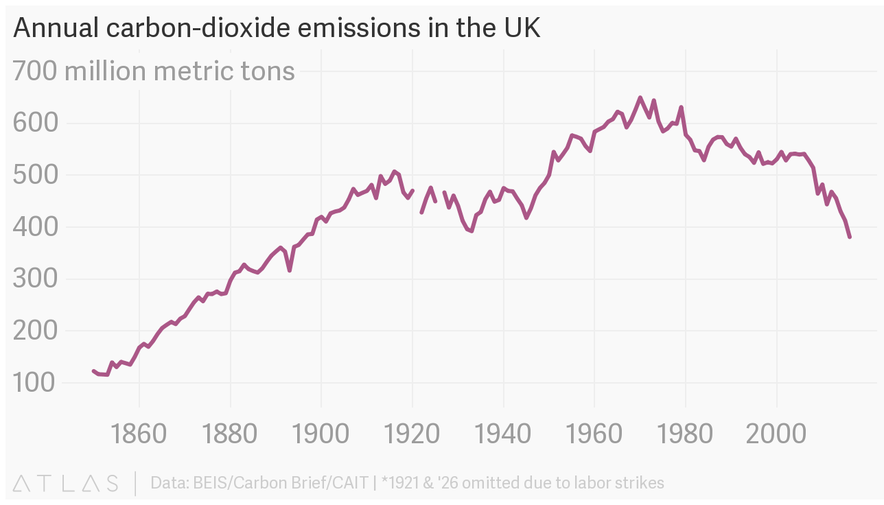 ‘CO2-uitstoot in het Verenigd Koninkrijk is vorig jaar gedaald en nu op het laagste niveau sinds 1894 – oftewel, de tijd dat meeste Britten zich met paard en wagen vervoerden.’ Goede lead van Quartz. De CO2 uitstoot in Engeland daalde de afgelopen jaren scherp vooral door het sluiten van kolencentrales en extra belasting op kolen-gestookte energie. Die werd vorig jaar verdubbeld. Hoe zou dat in Nederland zitten? De meest recente cijfers die ik kon vinden waren van 2015. Toen stootte Nederland ongeveer 170 miljoen ton CO2-equivalenten uit. Engeland produceerde een jaar later 381 miljoen ton. Het VK heeft 65 miljoen inwoners. Dus … vier keer zo veel inwoners, twee keer zo veel CO2. Zijn Nederlanders twee keer zo vies als Britten?
