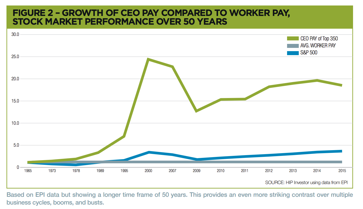 Voorzitters van besturen in de VS – dat zijn dus gewone werknemers, niet ondernemers – zagen sinds ongeveer 1980 hun salarissen als een raket stijgen; terwijl die van ondergeschikten gelijk bleven.