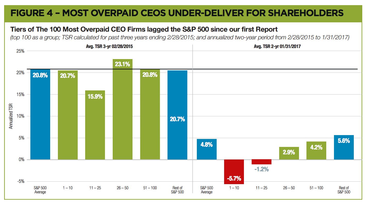 En de best betaalden leverden niet de beste prestaties. (Lastig te lezen grafiek, TSR staat voor Total Shareholder Return.) Studie van ‘As You Sow,’ via Barry Ritholtz. Als u die te links vindt: Harvard Law School publiceerde iets vergelijkbaars.