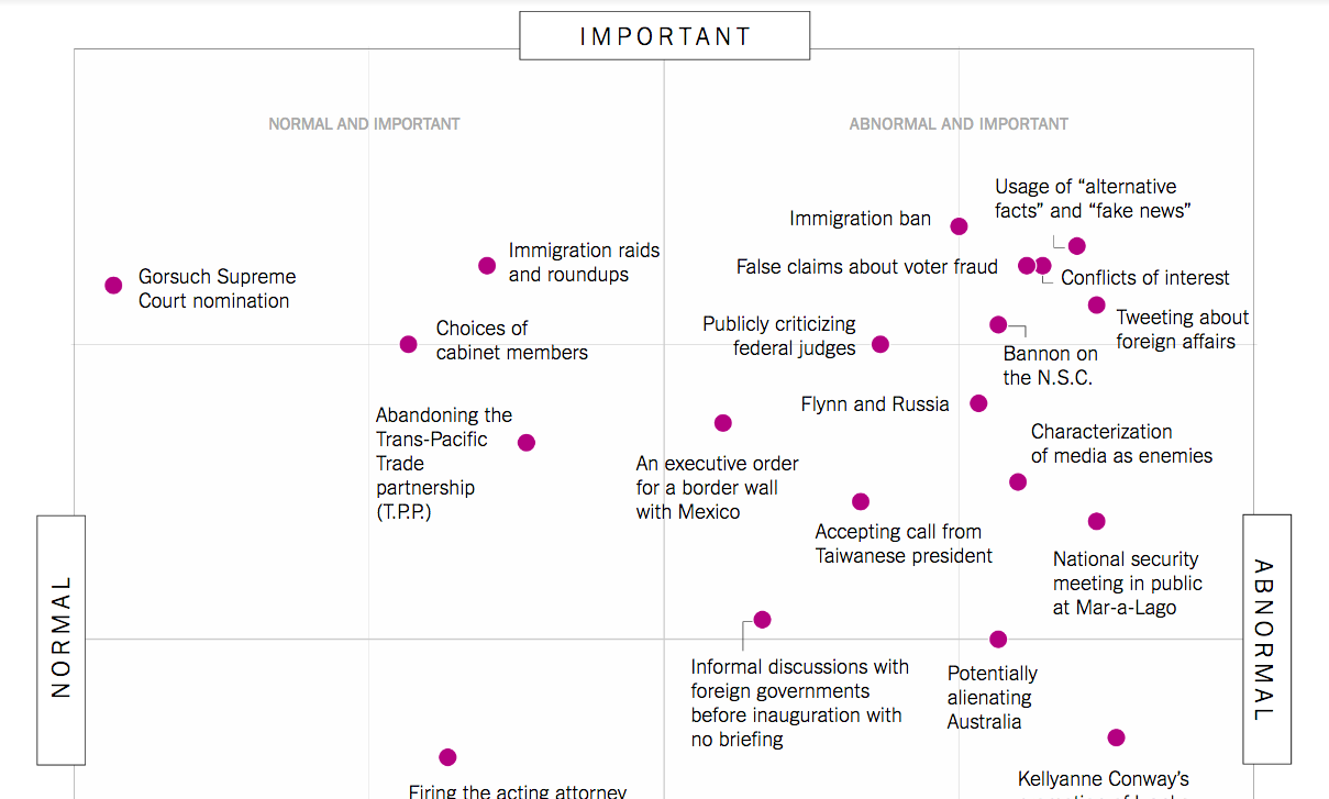 Gedeeltelijke screenshot van matrix in de NY Times. Subjectief? De kwalificaties ‘normaal’ en ‘abnormaal’ en ‘belangrijk’ en ‘onbelangrijk’ werden gegeven door een panel van 15 mensen die beroepsmatig politiek volgen, van links tot rechts. Bio’s van de panelleden onderaan. Oordeel zelf.