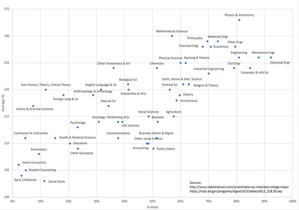Hoe exacter de studie, hoe hoger het IQ van de studenten en hoe hoger het percentage mannelijke studenten. Of trekt u nog andere conclusies uit deze grafiek?