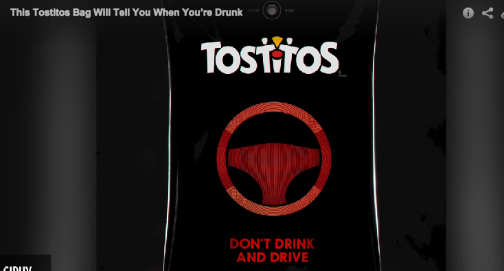 Deze zak Tostitos (een soort chips) geeft een signaal als je te veel gedronken hebt. Als je in de zak blaast. Dan verschijnt dit icoontje, en je krijgt met het zakje een kortingsbon van $10 op een Uber taxi. En als je zo lazarus bent dat je de toetsen niet meer kunt vinden hoef je alleen maar de telefoon tegen het zakje te houden want het heeft ook NFC. Stuntje van Tostitos ter gelegenheid van de Super Bowl.