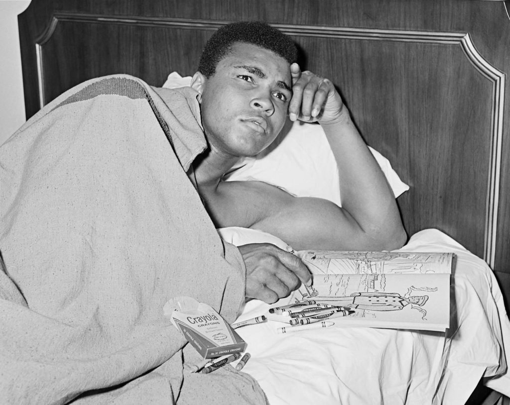 Muhammed Ali in bed met krijtjes en een kleurboek over militairen (1967). Onderdeel van een fototentoonstelling in de New-York Historical Society tot 26 maart. Ali zou dit jaar 75 zijn geworden.