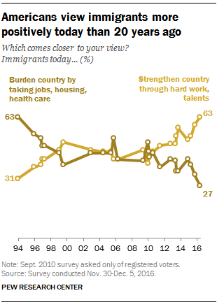 Amerikanen hebben een veel positievere kijk op immigranten dan 20 jaar geleden. Schiet mij maar lek.