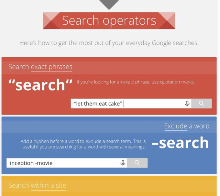 … zeiden we vroeger bij de ‘krant.’ Twaalf trucjes om beter via Google te zoeken. Onderstaande is slechts een screenshot van een beperkt aantal, klik voor de volledige lijst.