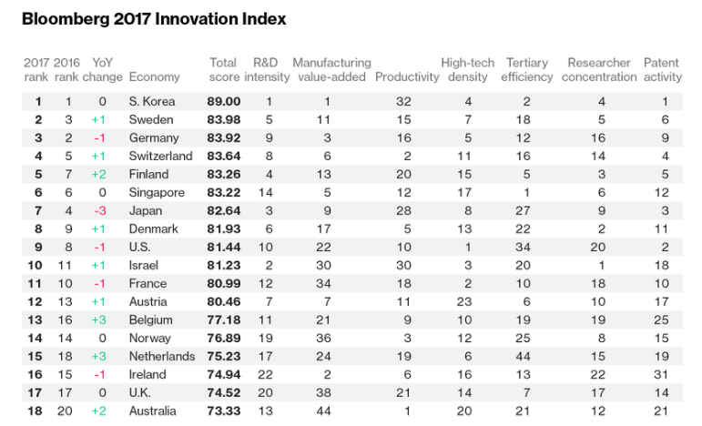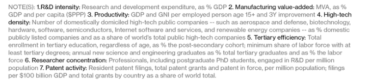Oftewel: R&D uitgaven als percentage van BBP en van de bevolking, Toegevoegde waarde van bedrijven, aantal beursgenoteerde high-tech bedrijven, percentage universitair geschoolden, patenten aangevraagd.