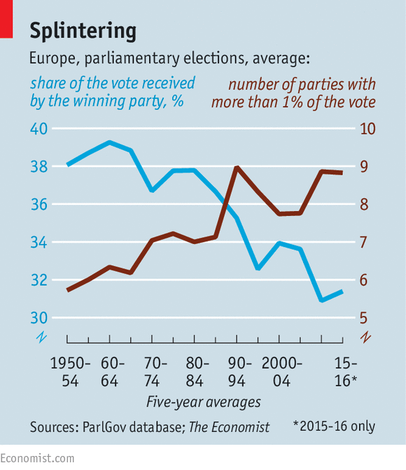 Nederland is niet meer het enige land in Europa dat ‘splinterpartijen’ kent. En dat is goed nieuws. Binaire verkiezingen – referenda, twee-partijenstelsels – bevorderen extreme standpunten. Veel partijen bevordert coalitiedenken en gematigdheid.