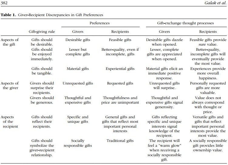 U koopt cadeaus en doet moeite voor de ontvanger. U loopt stad en land af, let niet op een paar euro’s en koopt datgene waarmee u een verpletterende indruk maakt. Zinloos, volgens deze studie. De reactie bij het uitpakken zegt niets over de tevredenheid op de lange termijn. Meer moeite en dure cadeaus kunnen nauwelijks op extra waardering rekenen. ‘Sociaal verantwoorde’ cadeaus al helemaal niet. ‘Praktische’ cadeaus daarentegen worden wel geapprecieerd. Maar we geven niet graag praktische cadeaus, want die zijn saai en soms voorspelbaar. Combineer ze daarom met een kleine gadget, iets frivools. Bestudeer onderstaande kaart, voordat u winkelen gaat. (van M. Hubeler)