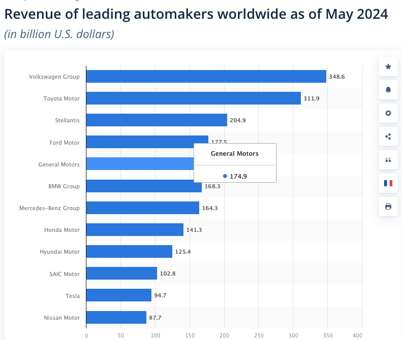 Dit plaatje vergt wel enige kanttekeningen. Dit is beurswaarde. Is dus niet een weergave van verkoopcijfers, maar van de verwachting van beleggers. Dus altijd een momentopname. En ... heeft China echt een 'beurs?' Dat gezegd hebbende: Stellantis (Fiat, Peugeot, Citroen, Opel, Chrysler etc) is piepklein! Zelfs Ferrari, dat ongeveer anderhalve auto per maand verkoopt, is twee keer zo veel waard. De machtige Duitse auto-industrie nu minder waard dan Chinezen. En Tesla is zes keer zo veel waard als Toyota.