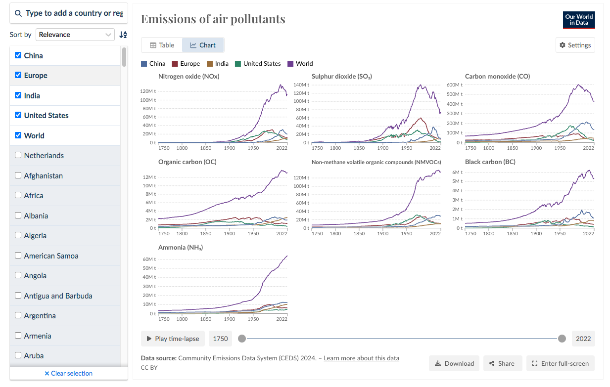 Dan wordt duidelijk dat alle industriële grootmachten al tien of meer jaar bezig zijn hun uitstoot van nare stoffen te verminderen. Zelfs India lijkt op de meeste criteria een plafond te hebben bereikt. Frappant: de VS, toch de grootste economie met de goedkoopste fossiele brandstoffen, is in bijna alle categorieën de schoonste. Uitstoot van de hele wereld is enorm - logisch, arme landen hebben geen geld om 'schoon' te stoken - maar ook daar: de daling is ingezet.