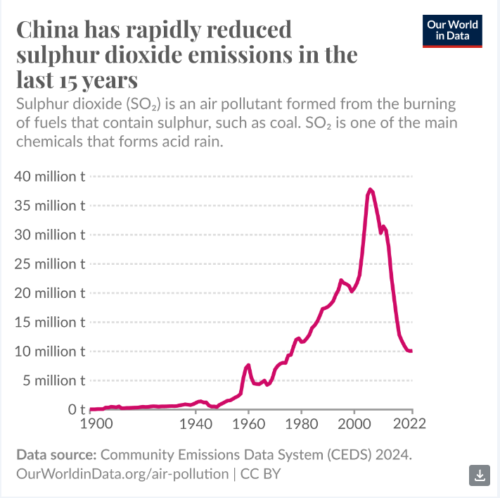 Kijk nou eens, schrijft Hannah Ritchie, hoofdredacteur van OWID: China heeft de uitstoot van zwaveldioxide spectaculair teruggebracht: