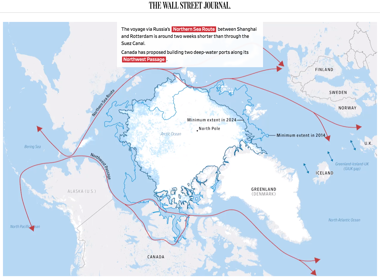 Schitterend overzicht van militair en economisch belang van de Poolcirkel. Actieve kaarten van scheepsverkeer, militaire bases, olie- en gasvelden, etc. Voorbeeld: Rotterdam-Sjanghai langs de noordkust van Rusland is twee weken sneller dan via het Suezkanaal.