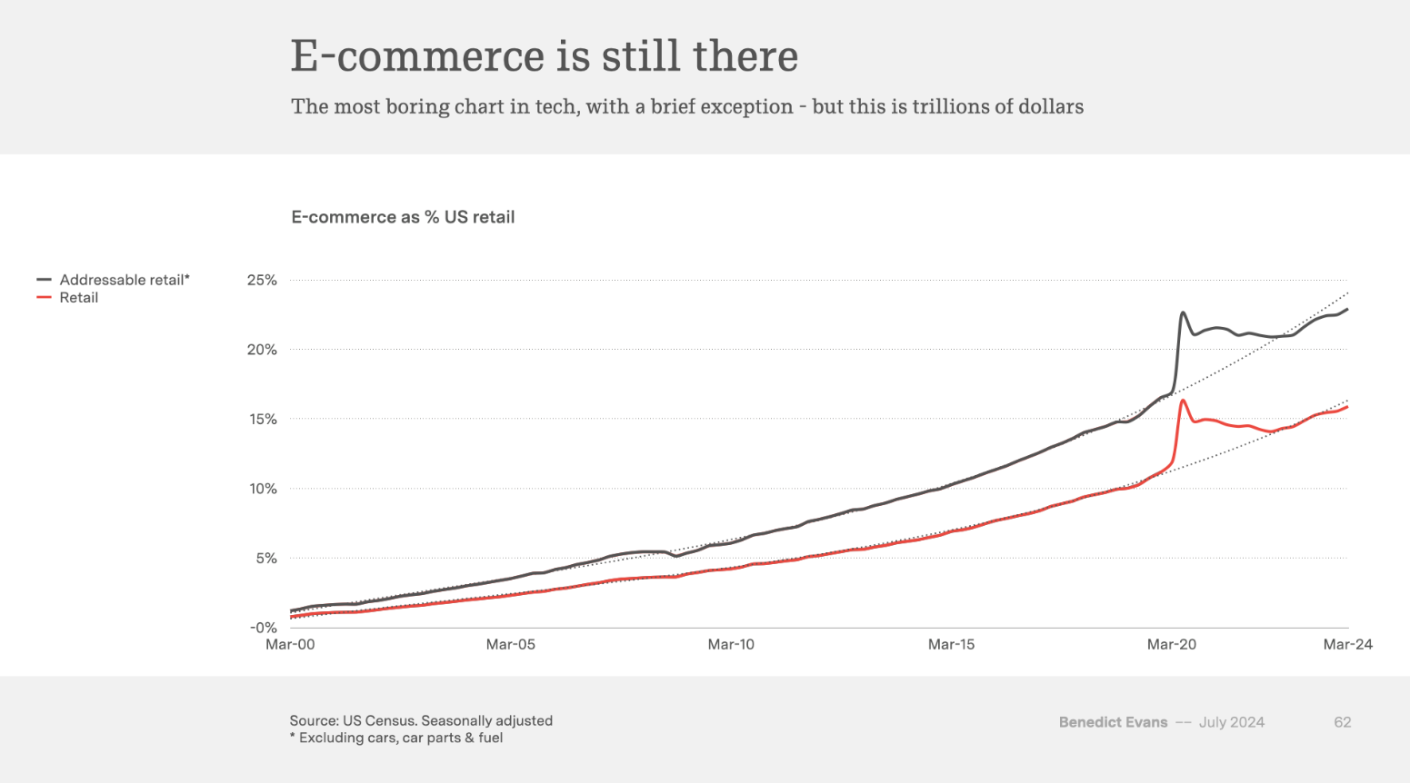 'Mijn oude baas Marc Andreessen zei altijd dat ieder idee dat in de 'dotcom bubble' uit elkaar spatte, nu een succes zou zijn geworden.' Zo begint Benedict Evans deze column. Oftewel: vooruitgang gaat langzaam. Online winkelverkopen zijn nog steeds minder dan 25% van het totaal in de VS (die zwarte lijn, is exclusief auto's en verwante producten). 'Cloud computing' bestaat nu tien jaar en is nog steeds maar 30% van computergebruik van bedrijven. Zelfs de iPhone had vier jaar nodig voordat hij begon de markt te veroveren.