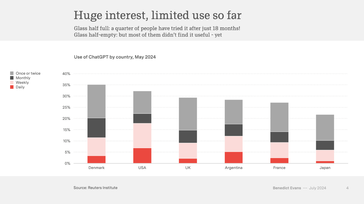 Oftewel: verwacht nu niet dat AI snel gemeengoed wordt. Op dit moment: enorme belangstelling, enorm veel mensen die met Chat GPT hebben kennisgemaakt - maar relatief weinig die terugkeren: