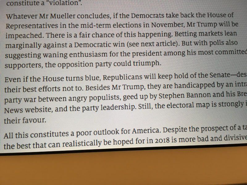 Deze zin (de eerste hierboven) heb ik gisteravond een paar keer herlezen. ‘Als de Democraten in 2018 een meerderheid winnen wordt Trump impeached.’ Uit The Economist ‘The World in 2018.’ Waar halen ze die stelligheid vandaan? (Betaalmuur, uit hoofdstuk ‘The Show Goes On’) Toevoeging: The Guardian van hedenmorgen.